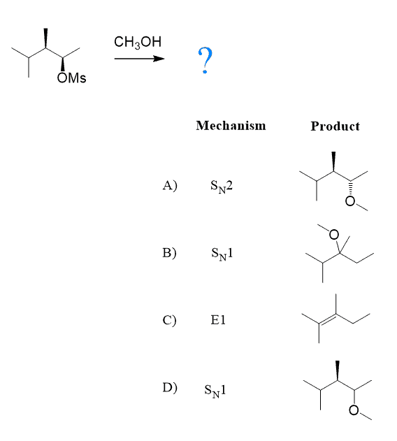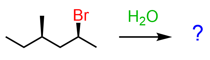 Do not automatically replace the leaving group with the nucleophile in subsection reactions. Always keep in mind the possibility of rearrangements when you see tertiary and secondary carbons next to each other. For example, what is the mechanism and major product of the following substitution reaction?