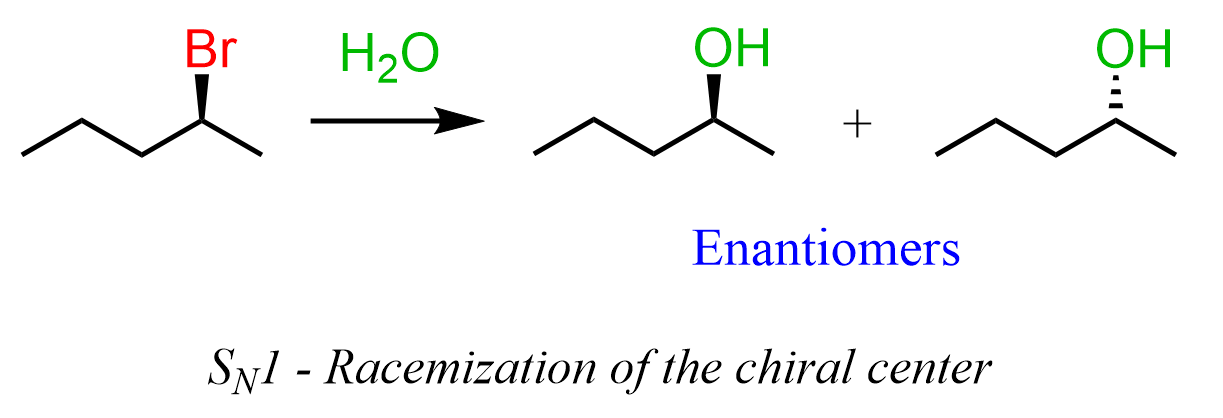 We know that SN1 reactions proceed via the formation of carbocation intermediates, and the nucleophilic attack on them occurs from both faces of the planar carbocation. As a result, a pair of enantiomers is formed when the addition of the nucleophile generates a chirality center: