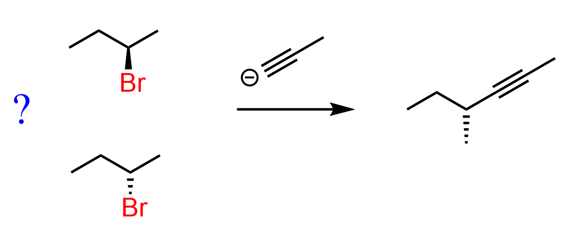This is all true until we see a reaction when the leaving group is neither a wedge nor a dash. For example, which alkyl halide would give the desired product in the following SN2 reaction?