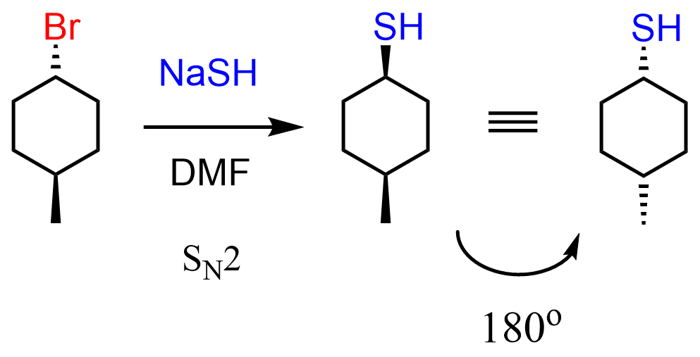 Another common confusion related to the wedge and representation of the leaving group and the nucleophilic in SN2 reactions is when the molecule is flipped in the product. For example, what is the mechanism and product of the following reaction?