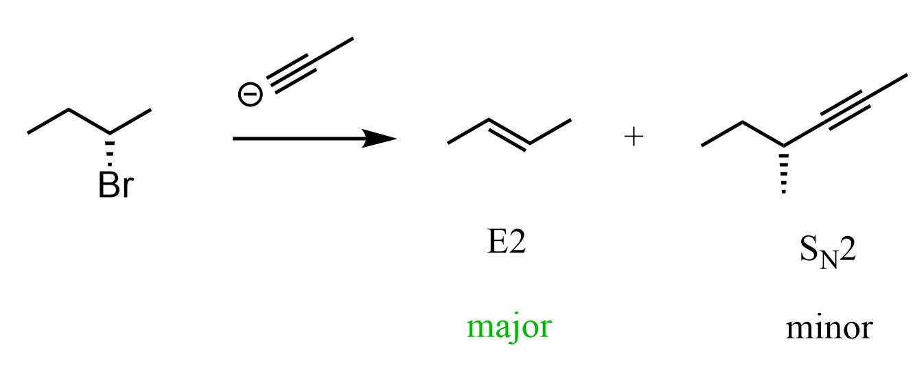 I want to mention that good nucleophiles that are also strong bases will mostly do E2 on secondary alkyl halides. However, I wanted to have a carbon nucleophile to address some tricky parts related to wedge and dash representations in SN2 reactions.