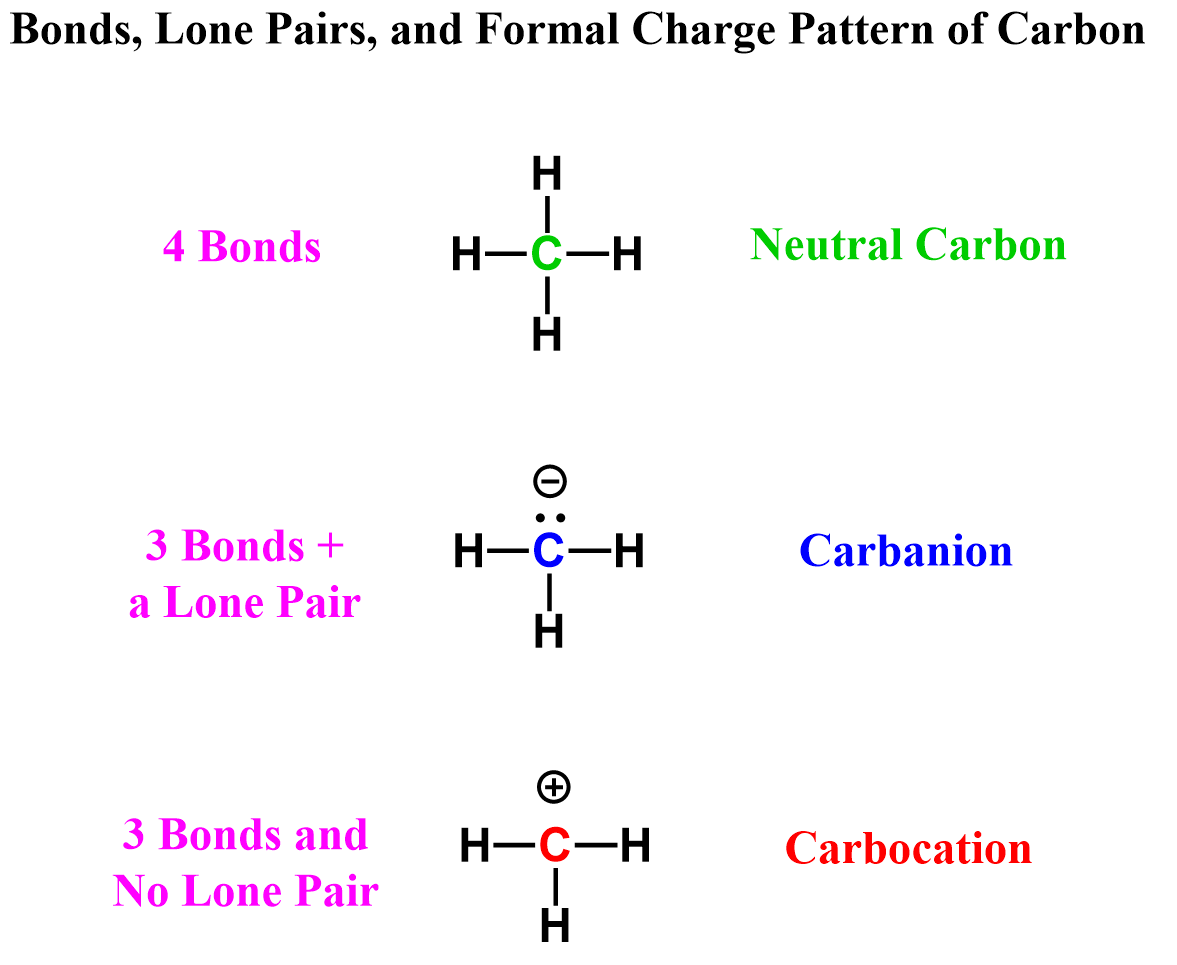 Here are some examples of using the formula for calculating the formal charge of carbon is neutral and ionic states where a formal charge is assigned: