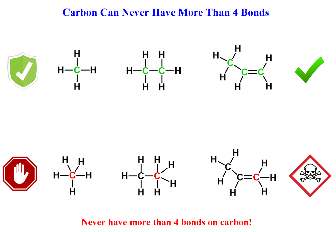 You have already learned that carbon likes to have four bonds as it fulfils the octet without the “need for thinking” about lone pairs or formal charges. So, that is the very beginning of bonding patterns in organic chemistrynever show a carbon with five bonds.