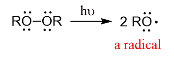 The reaction goes by a radical mechanism when a peroxide is present. The first step is the homolysis (homolytic cleavage) of the RO-OR bond: