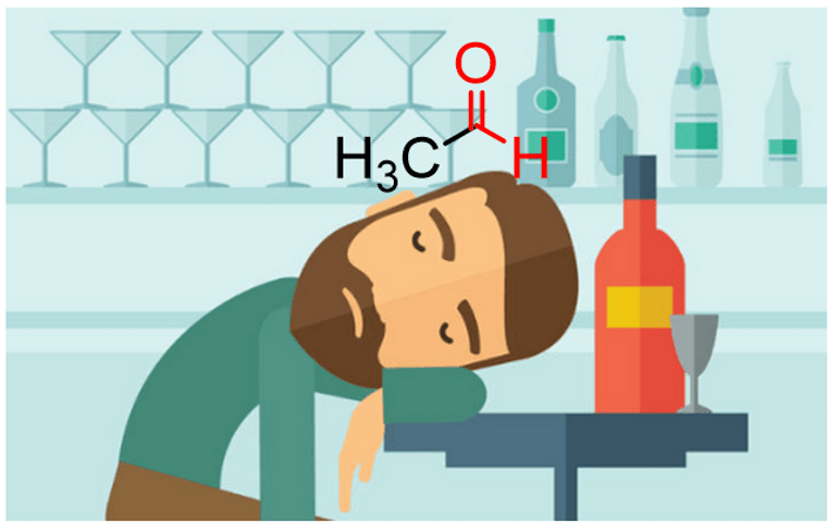Acetaldehyde is a naturally occurring aldehyde that is also produced on a very large scale for the chemical industry. It is also produced in the human body from ethanol by the Alcohol dehydrogenase enzymes and is partly responsible for the cause of the hangover.