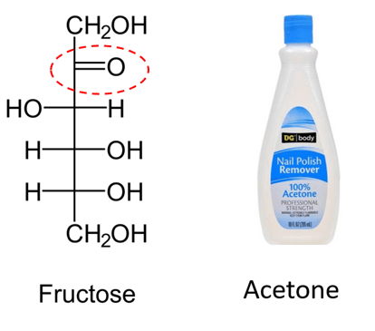 Some of the ketones, such as ketoses (e.g., fructose), are of great biological importance. Acetone is a commonly used solvent in organic labs and a nail polish remover.