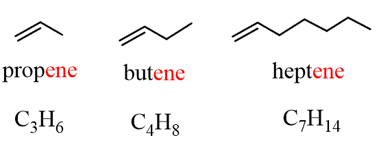 The presence of a double bond decreases the number of hydrogens per carbon atom and the general formula changes from CnH2n+2 to CnH2n.