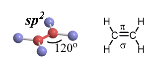 The two carbons with the double bond are sp2–hybridized, and the geometry is trigonal planar with a 120o angle between the atoms. The double bond is made of one σ and one π bond.