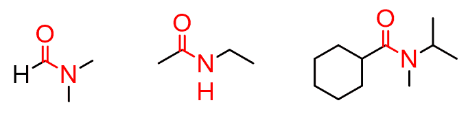 Just like for the amines, depending on the number of carbons connected to the nitrogen, we have primary, secondary, and tertiary amides. Notice that the carbonyl carbon is also counted: