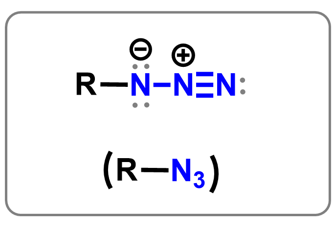 Azides are functional groups with the formula –N₃, consisting of three nitrogen atoms in a linear arrangement. They are generally used as intermediates in organic synthesis for preparing amines and other nitrogen-containing compounds. Azides are especially important in click chemistry, where they react with alkynes in a copper-catalyzed cycloaddition to form triazoles, which are types of aromatic compounds. Due to their explosive potential, some azides must be handled with care in the lab.