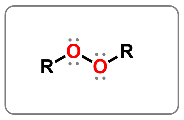 Peroxides are functional groups with an –O–O– single bond, where two oxygen atoms are directly connected. This bond is weak and highly reactive, which makes peroxides useful as oxidizing agents and radical initiators in organic reactions, especially in polymerization. A well-known example is hydrogen peroxide (H₂O₂), a simple inorganic peroxide commonly used as a disinfectant, bleaching agent, and antiseptic in everyday life.