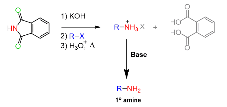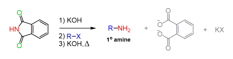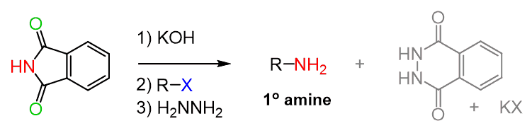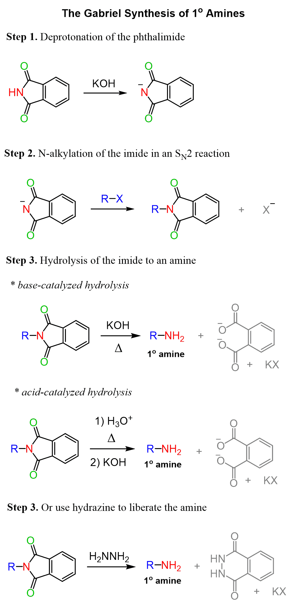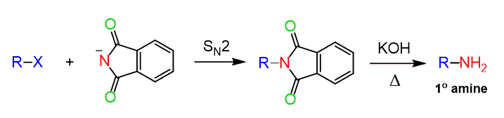 Let’s put together a summary of the Gabriel reaction for preparing1° amines in which the overall result is nucleophilic substitution of X by NH2, so the Gabriel synthesis can be used: