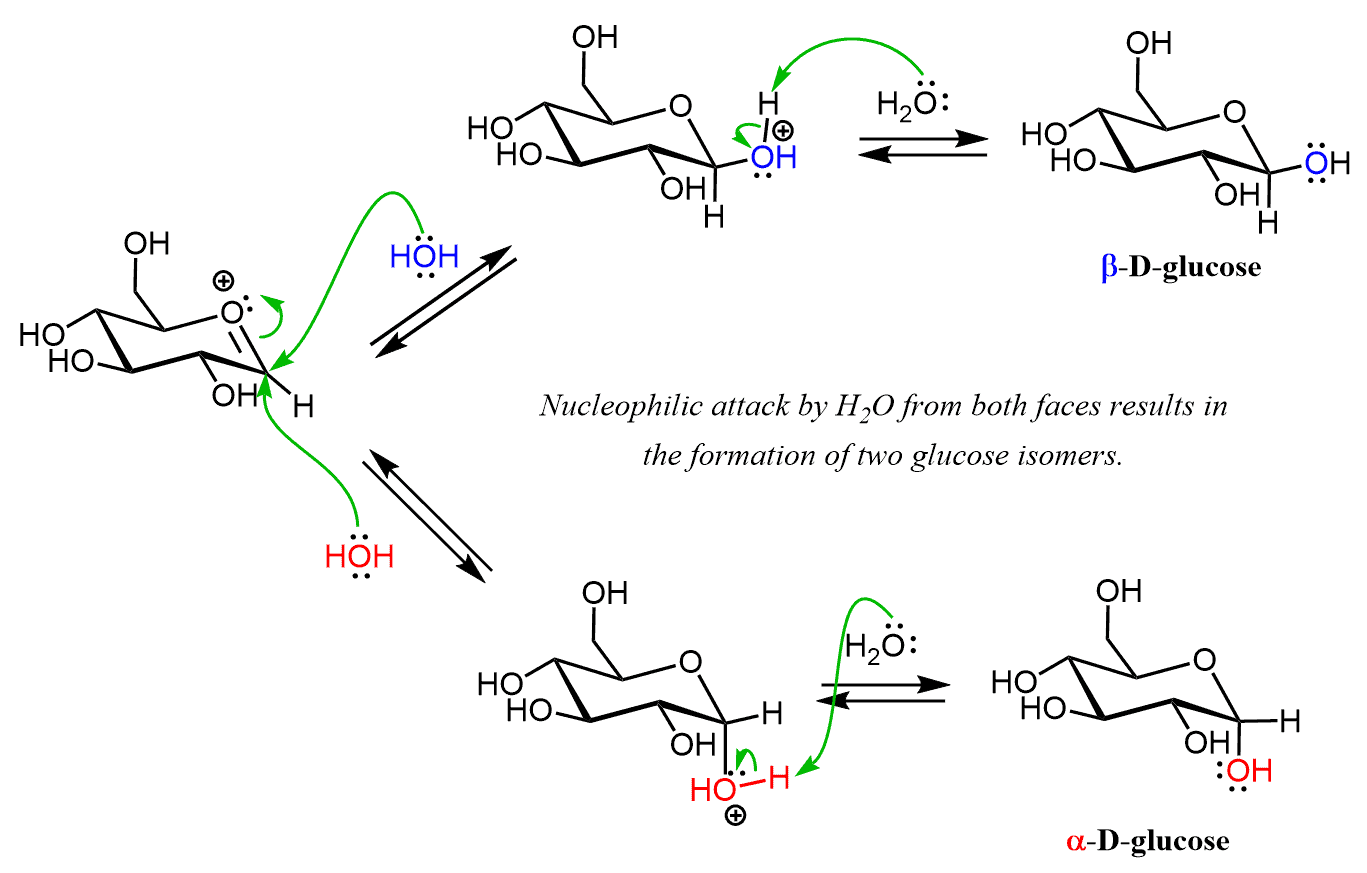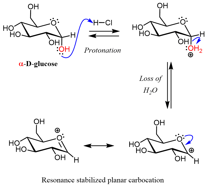Let’s now understand why starting, for example with α -D-glucose, two diastereomers are formed rather and retaining or changing the configuration of the anomeric carbon. In the first step, the anomeric hydroxyl group is protonated and expelled by the lone pairs of the neighboring oxygen in the ring.
