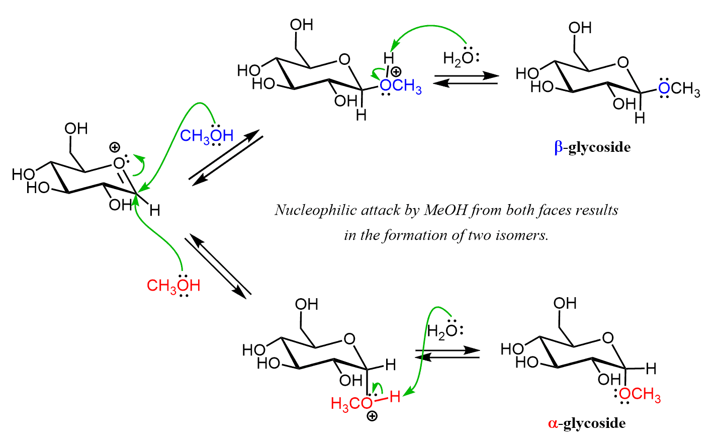 For example, treatment of α- or β-D-glucose with methanol and HCl forms two anomeric glycosides where the OR group is now pointing up and down:
