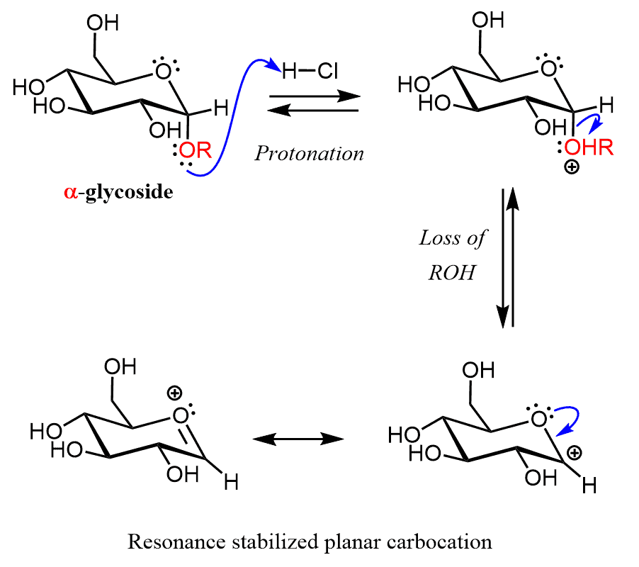 The hydrolysis starts with the protonation of the alkoxy group on the anomeric carbon followed by the formation of a planar carbocation.