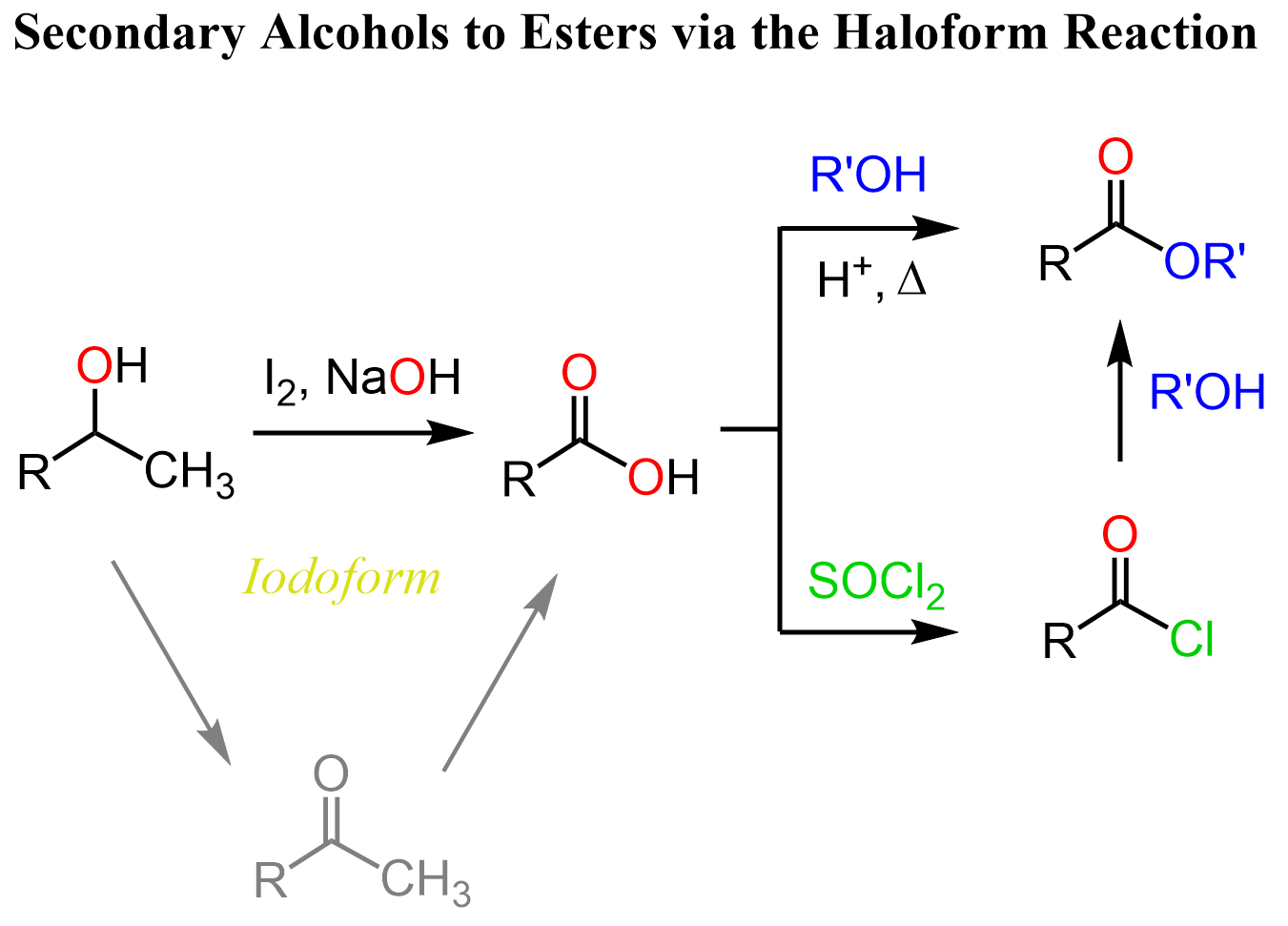 It is worth mentioning that the haloform reaction works not only for methyl ketones but for many precursor alcohols which are oxidized in situ to the corresponding methyl alcohol. For example, we can convert secondary alcohols to esters and other derivatives of carboxylic acids using the haloform reaction: