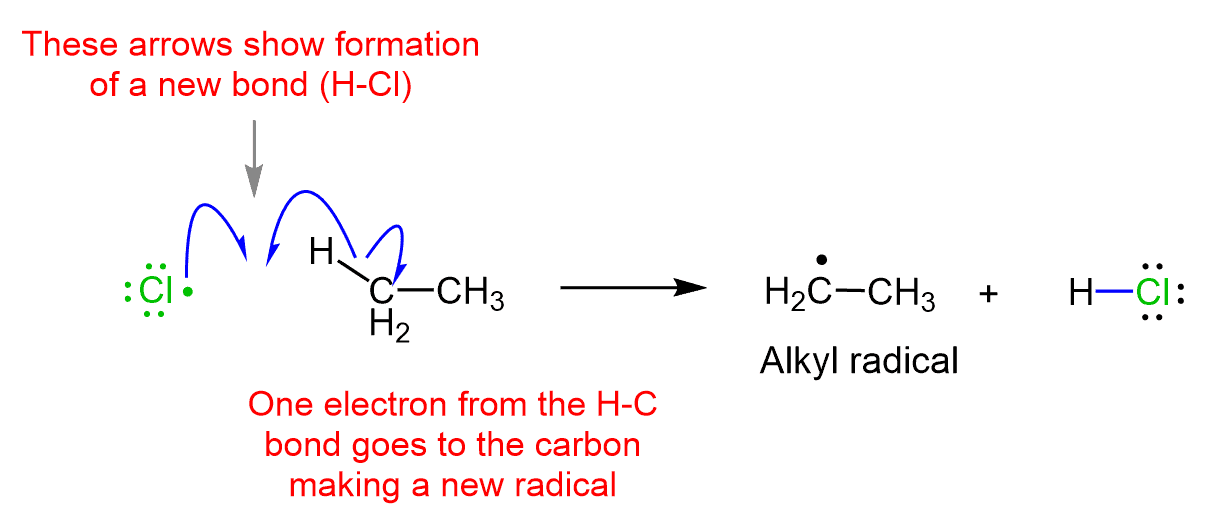 For example, the Cl radical formed in the first step quickly reacts with ethane by abstraction a hydrogen and generating a new radical: