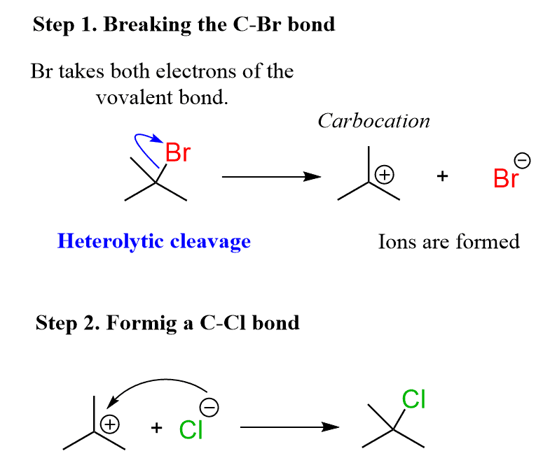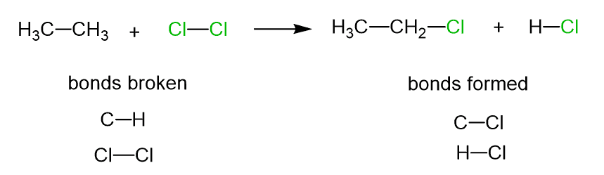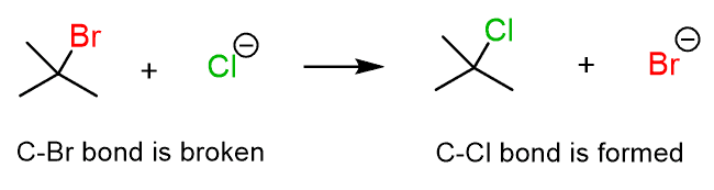 Chemical reactions are rearrangements of atoms as the bonds between them are broken and new ones are formed. For example, in the following reaction, the C-Br bond is broken, and the C-Cl bond is formed: