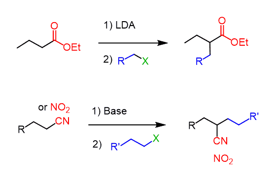 The alkylation works also with other functional groups such as esters, nitriles, and nitro compounds since they also have an acidic ɑ position: