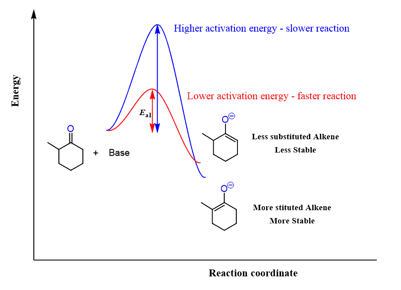 The less substituted enolate is the kinetic product (red pathway below) as seen from the lower activation energy (Ea) and therefore occurs faster.
