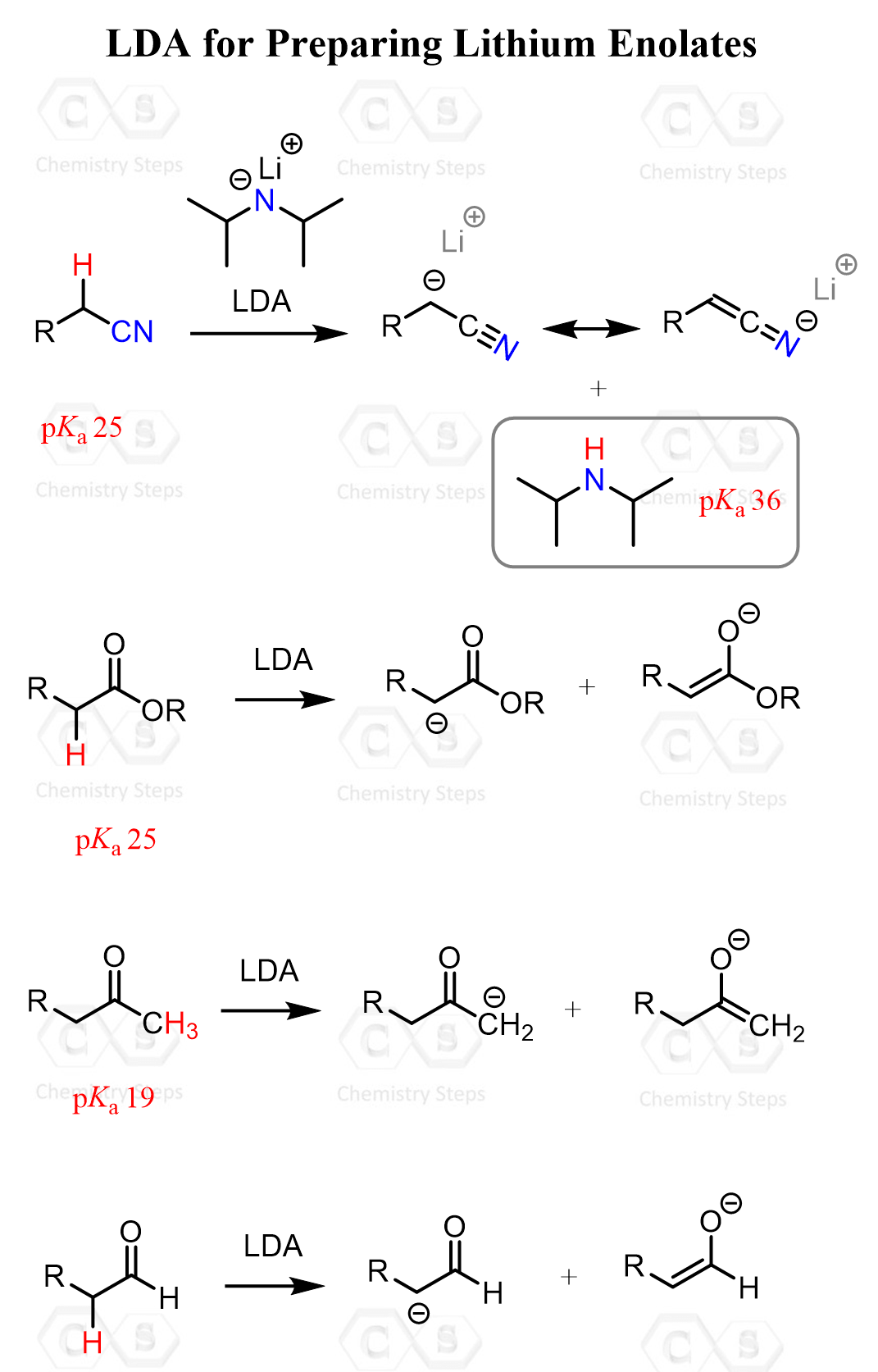 Notice that in the unsymmetrical ketone, the methyl carbon is deprotonated instead of the one next to the R group. This is a key feature of LDA: its steric bulk, which prevents it from acting as a nucleophile. Instead of attacking the carbonyl carbon, it selectively removes the α-proton, forming the corresponding carbonyl or other C-H acid, such as for exokae nitreiels, in a clean and controlled manner.