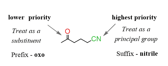 The nitrile group stands higher than the ketone; therefore, the parent chain will take the suffix from the nitrile group. In this case, it is the same as the functional group name – nitrile. The longest chain contains six carbons, so the hexane changes to hexanenitrile: