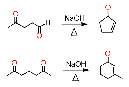 If a compound has two carbonyl groups (dicarbonyl compound), it undergoes an intramolecular aldol reaction if a five- or six-membered ring can be formed: