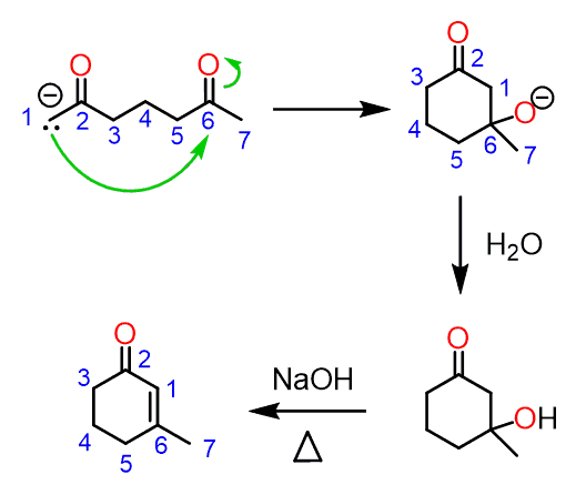 Formation of a six-membered ring follows the steps and mechanism – deprotonation, intramolecular aldol addition, proton transfer and E1CB elimination to yield the ɑ,β-unsaturated carbonyl compound: