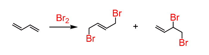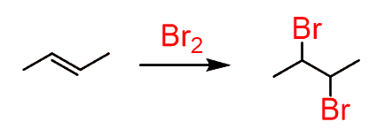 We have seen many different addition reactions of alkenes and conjugated systems. One of them was the reaction of alkenes with bromine. Bromine is a red liquid and it is an indicator for the presence of alkenes since the double bond reacts very quickly decolorizing its red solution: