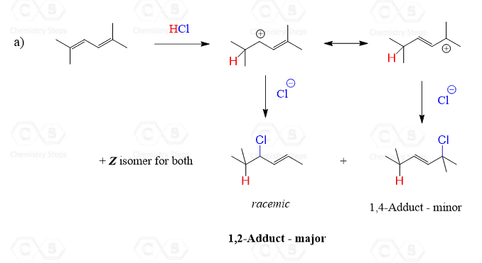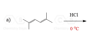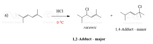 Predict the kinetic or thermodynamic product of electrophilic addition to each conjugated diene: