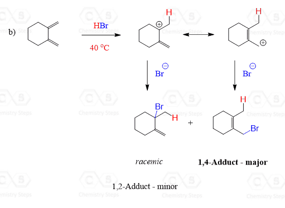 The diene in this reaction is symmetrical and therefore protonation of only one of the two double bonds is considered for predicting the structure of organic products.