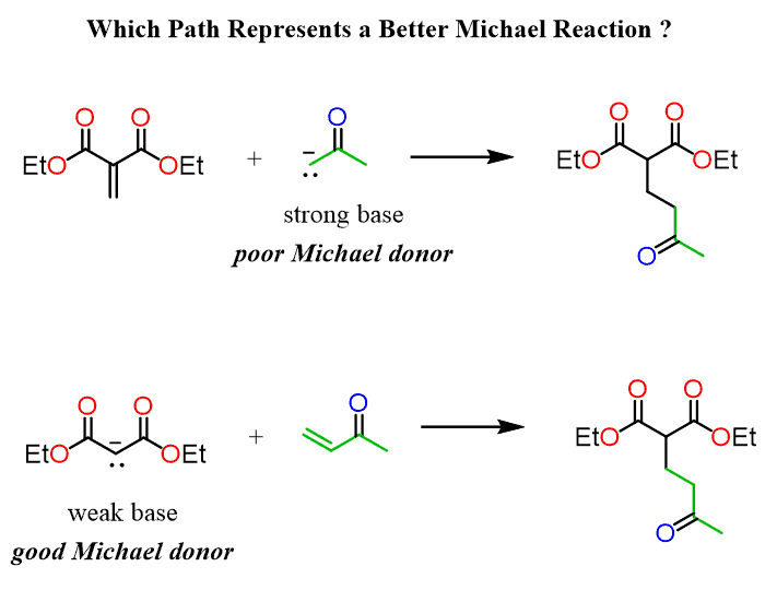 The above-shown example is a 1,3-diketone but other electron-withdrawing groups such as esters, nitriles, and nitro compounds in the same arrangement can also be Michael donors. Similarly, the electron-withdrawing group of the ɑ, β-unsaturated compound can be any of these as well.
