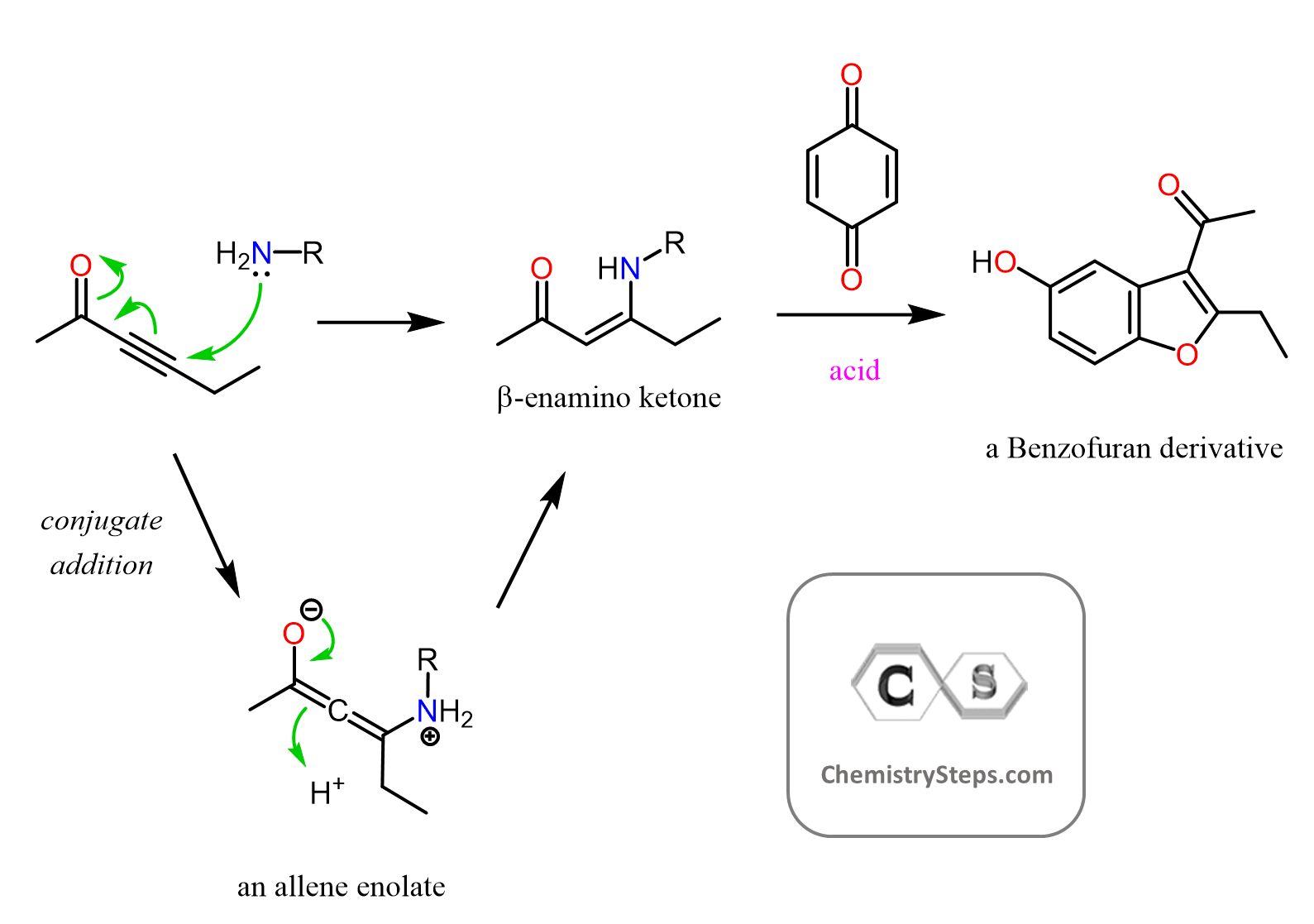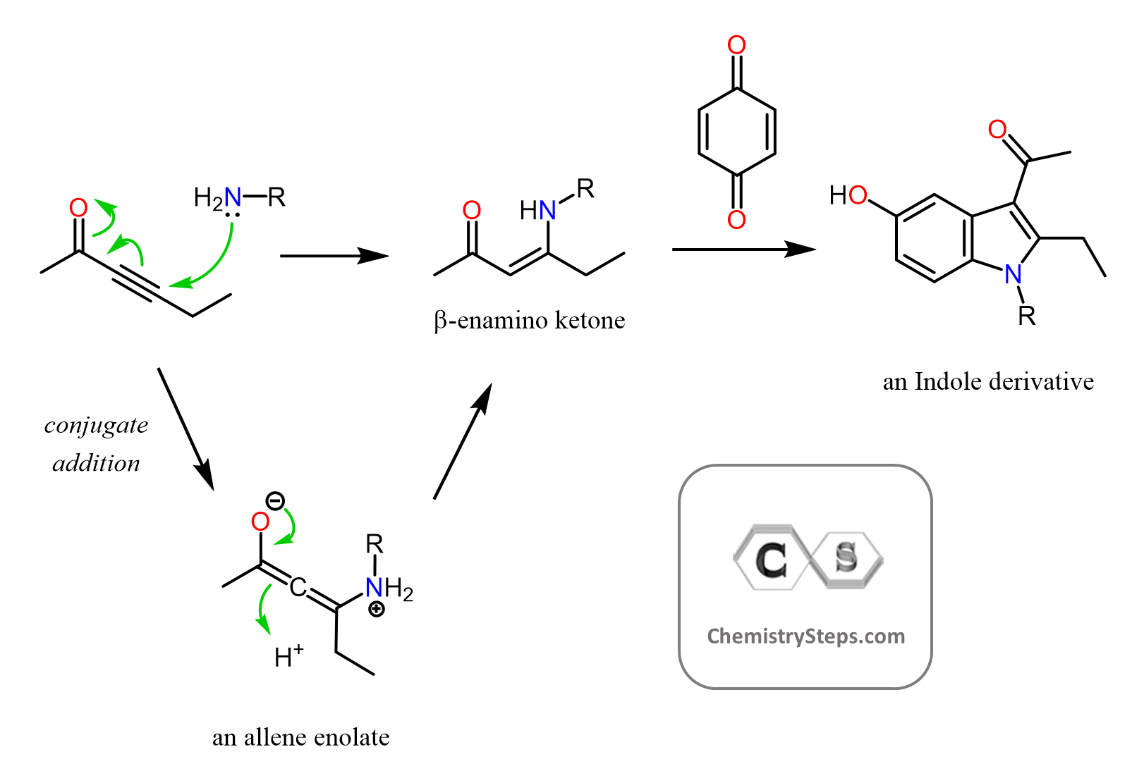 In the next step, the nucleophilic attack on the C=C double bond generates an enolate which after the protonation tautomerizes to the corresponding carbonyl compound: