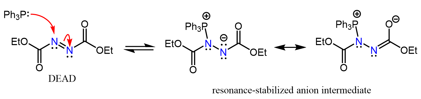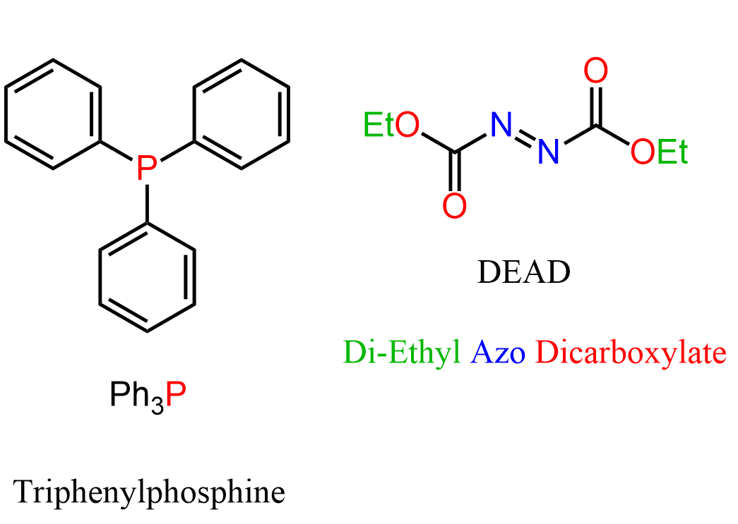 Notice that there are two reagents in the Mitsunobu reaction we have shown above: triphenylphosphine (PPh3) and DEAD (diethyl azosicarboxylate):
