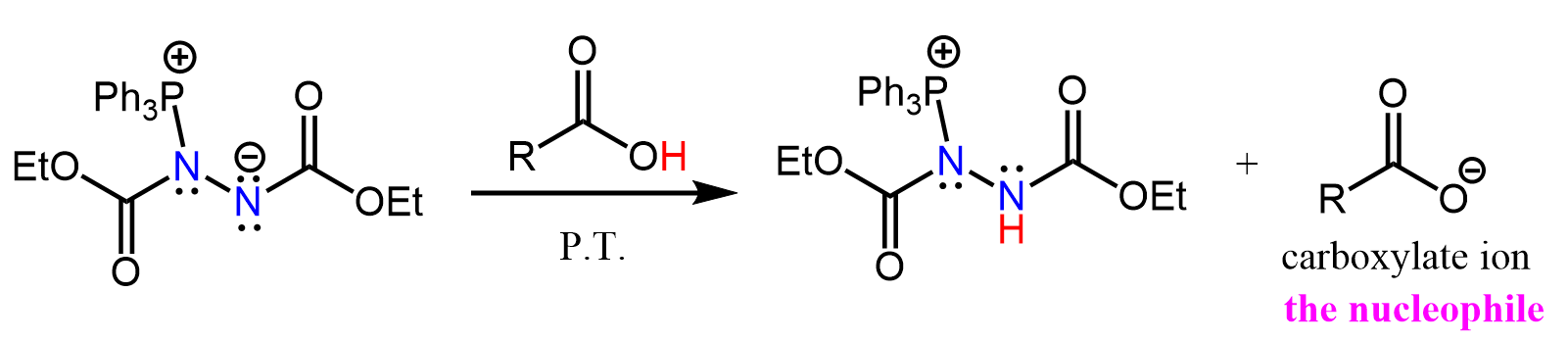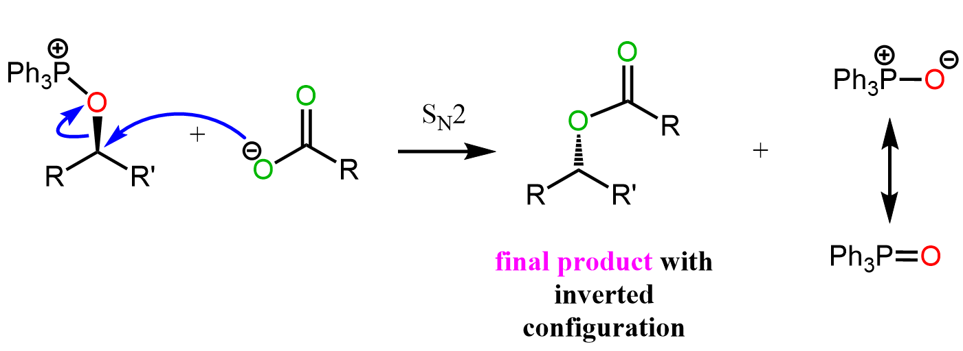 Recall that, despite being a weak base, the carboxylate ion is quite a good nucleophile and attacks the chiral center of alkoxyphosphonium ion by an SN2 mechanism to give the final product with inverted configuration: