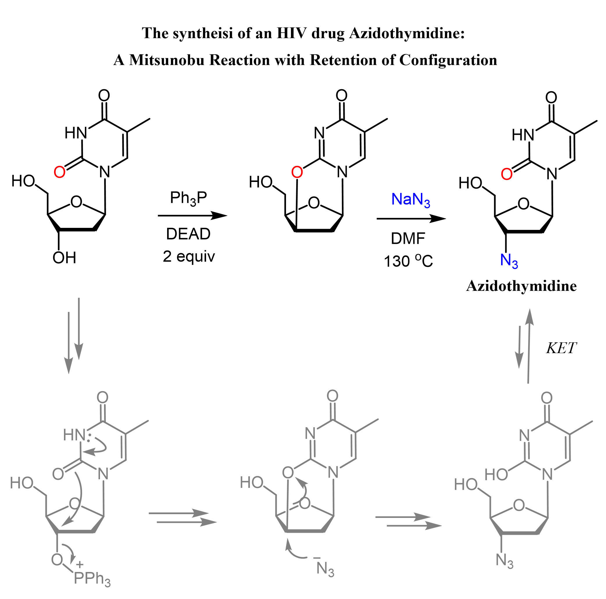 An interesting example of a Mitsunobu reaction with retention of the configuration is the synthesis of Azidothymidine (AZT)/Zidovudine (ZDV)/Retrovir/Retrovis, a drug approved for the treatment of HIV. In the first part, the OH group is activated with DEAD and Ph3P, which facilitates the intramolecular attack of the nucleobase carbonyl, forming a cyclic ether structure. This is the first SN2, which inverts the configuration of the chiral center, and the second SN2 occurs when the azide nucleophile attacks and opens up the cycle. Thus, the configuration is inverted twice, which means it is retained: