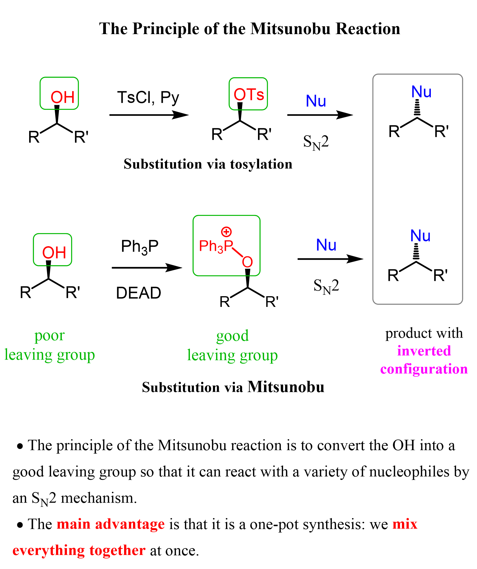 So, if one asks what the Mitsunobu reaction is used for, we summarize it as a strategy to replace the OH group with a nucleophile by an SN2 reaction. The main advantage of Mitsunobu reaction is that it is a one-pot synthesis: we mix everything together at once.