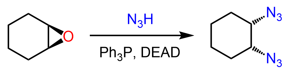 An interesting outcome is observed when epoxides are used in the Mitsunobu reaction. We know from their ring-opening reactions that good nucleophiles attack one of the carbons by an SN2 mechanism ,thus forming a product with an anti conformation. For example, azides open up the epoxide, placing the oxygen in an anti orientation: