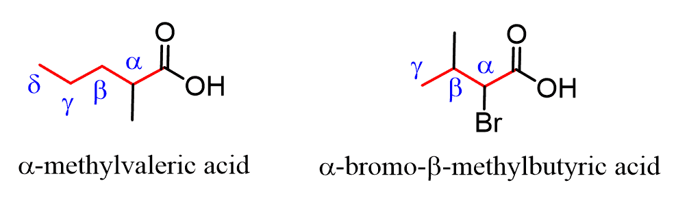 When substituted carboxylic acids are named by common names, the carbon positions are often designated with Greek letters. The carbon next to the COOH is called the ɑ carbon, followed by β, γ (gamma), δ (delta), etc. The last carbon can be referred to as W (omega) positions.
