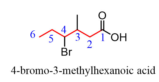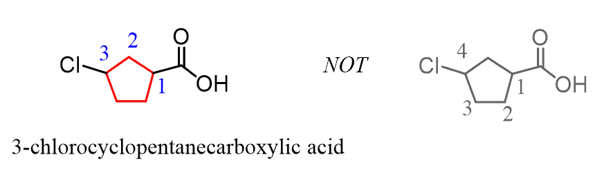 If substituents are also present, the numbering starts from the carbon connected to the COOH group and goes in the direction that minimizes the numbering of the substituents:
