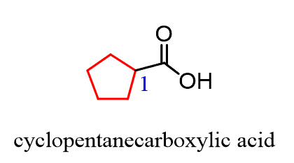 The only out-of-normal situation you may encounter is when the -COOH group is on a ring. In this case, we name the ring and add the words “carboxylic acid”: