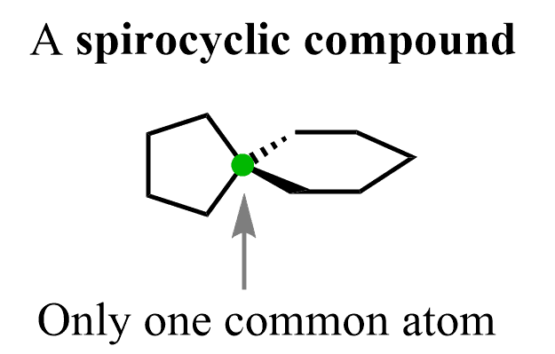 So, in bridged bicyclic compounds, the joint carbons are farther apart and when they get next to each other (connected) we have fused bicyclo compounds. The extreme end of this relationship is when there is only one common carbon, and these are called spirocyclic compound: