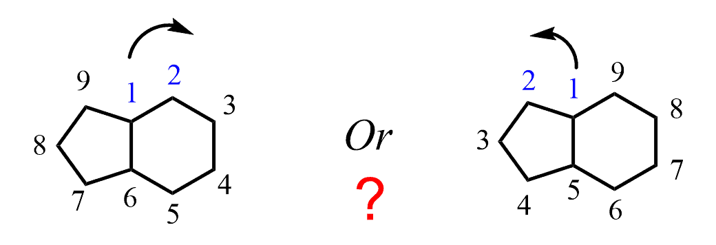 For this, you need to remember that the rings are numbered according to their size – the one with more carbon atoms is numbered first, then the second and etc. So here, we will go clockwise numbering the ring on the right and the one on the left: