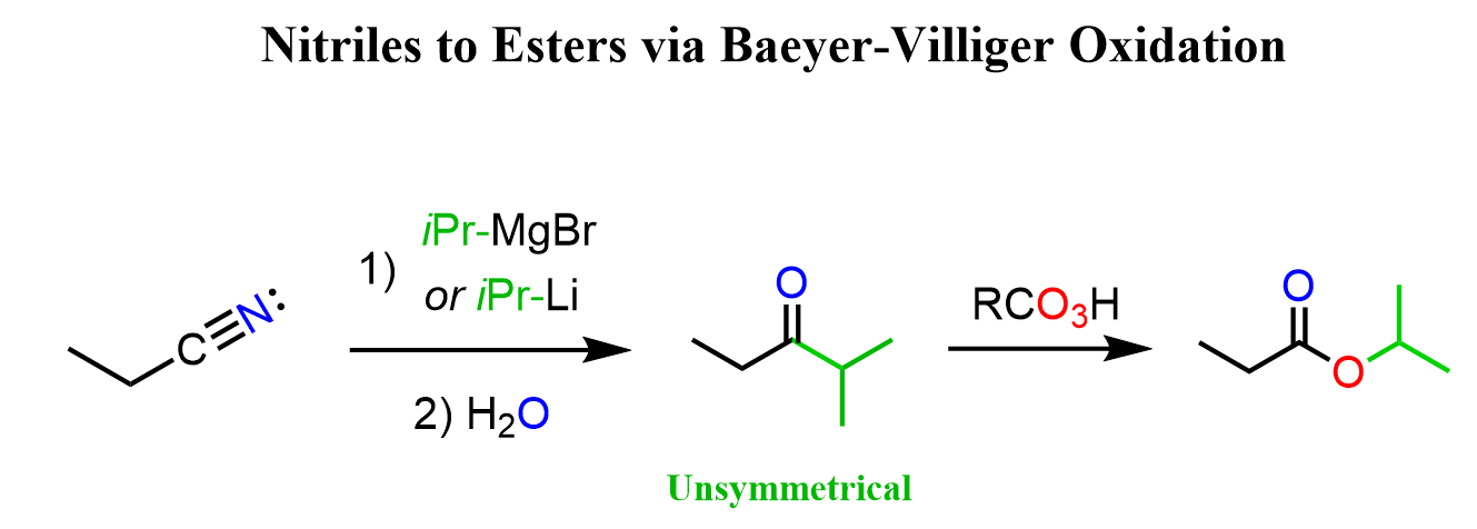 You might remember that nitriles react with Grignard and organolithium reagents to form ketones. Once we have the ketone, we can use the Baeyer-Villiger oxidation to convert it into an ester: