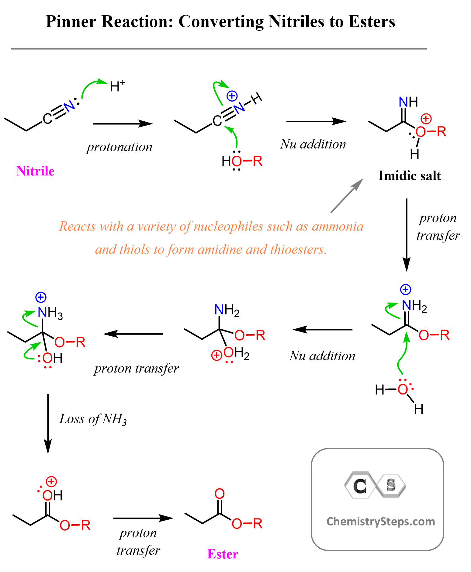 Check the linked article for more details on the mechanisms of all the reactions mentioned in this post, which is dedicated to summarizing strategies for converting nitriles to esters.
