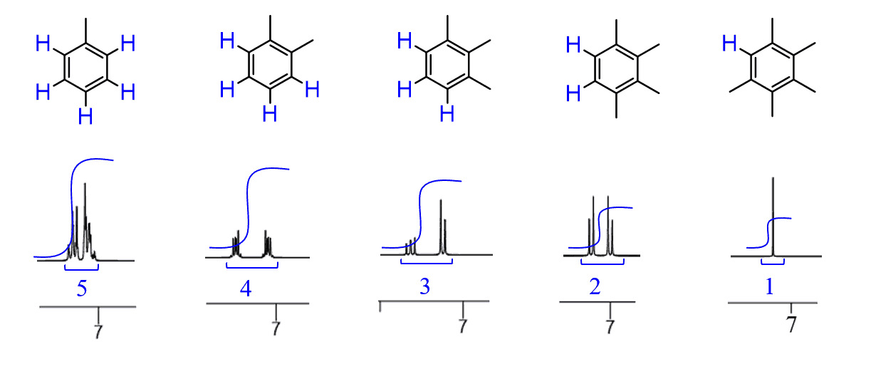 This is another great advantage of NMR spectroscopy – not only it tells you what types of protons you have based on their environment (neighboring atoms) but it also tells you how many protons you have. And that is not just how many protons in total, you can see specifically how many protons you have for the given signal, which is coming, for example, from an aromatic ring. Depending on how many substituents are on the ring we can have a monosubstituted, disubstituted or a pentasubstituted ring which changes the number of protons on the ring and we can see that on the NMR.