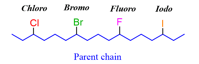 The nomenclature of alkyl halides follows the same IUPAC rules that we discussed for naming alkane. The only difference here is that one (or more) of the substituents is a halogen, and its naming is a little modified.