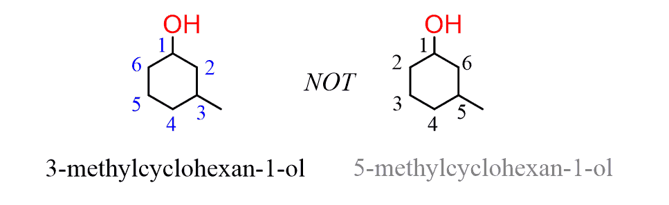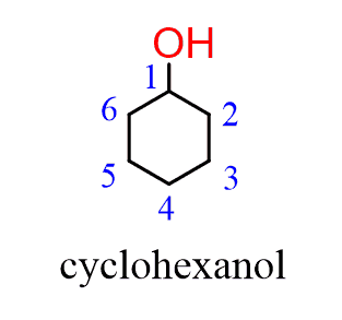 When naming a cyclic alcohol, start numbering the ring beginning with the carbon connected to the OH group. This rule always puts the OH group at C1, therefore, the “1” is usually omitted from the name: