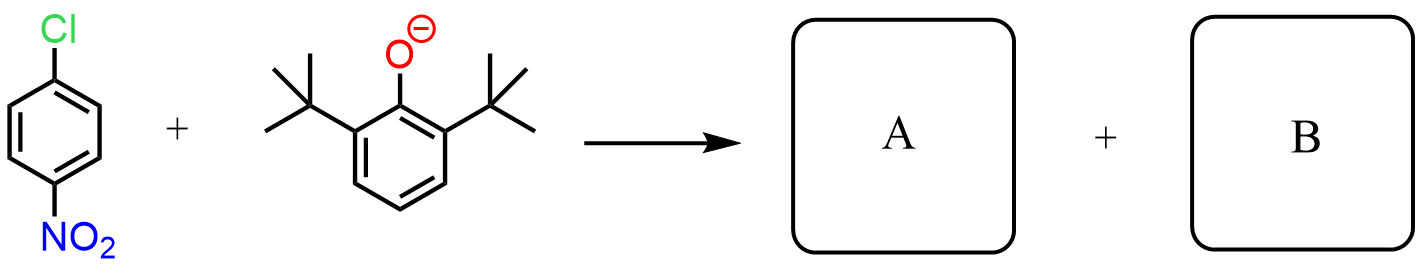 When the following phenoxide is reacted with 4-Nitrochlorobenzene, the expected product A of nucleophilic aromatic substitution is not formed. Instead, an isomer of compound A is formed. Identify the structures of both A and B and explain why only B is formed: