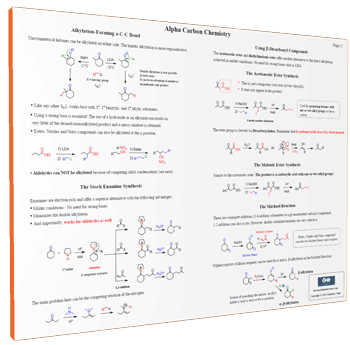 In this 3-page summary of the Alpha carbon chemistry, you will find the key concepts and reactions of enols and enolates such as the Thermodynamic and Kinetic Enolates and their most important reactions. It also summarizes the alkylation and condensation reactions such as the Aldol reaction, the Claisen reaction, Robinson annulation, Stork Enamine synthesis, Malonic Ester Synthesis, Acetoacetic Ester Synthesis, Michael Addition, and some more.